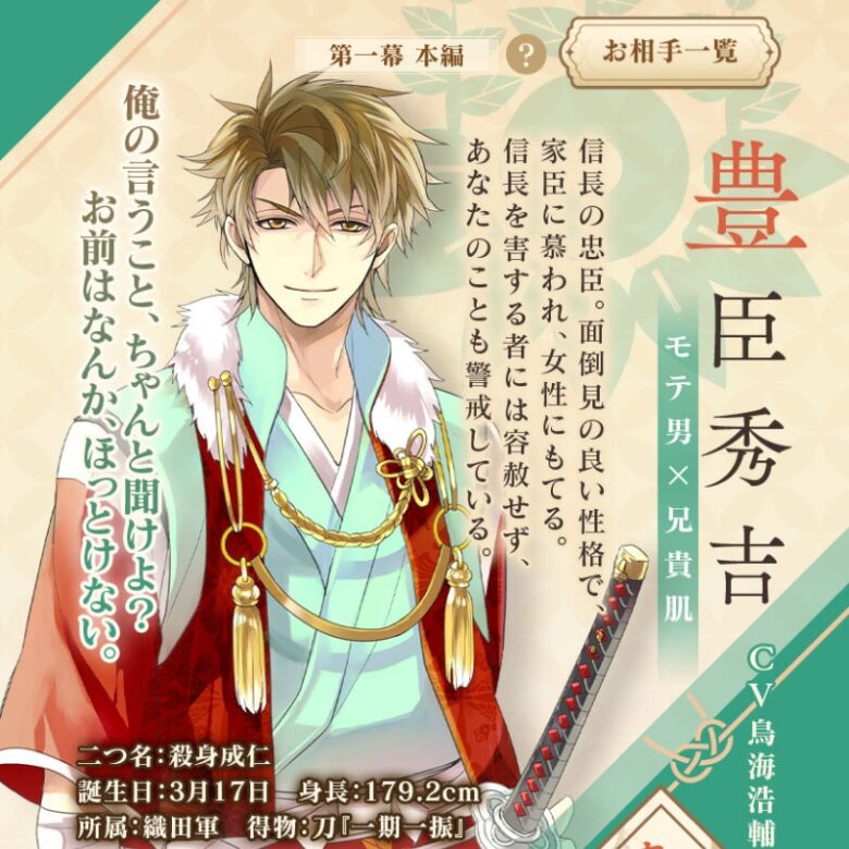 「秀吉色の瞳」(魅力100/★2)がもらえます